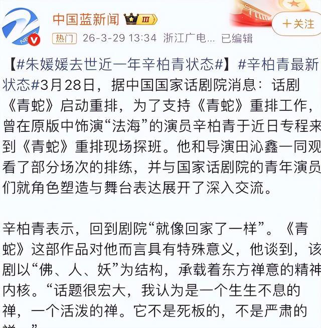 3月28日,国家话剧院官宣《青蛇》重排,辛柏青专门去探班。