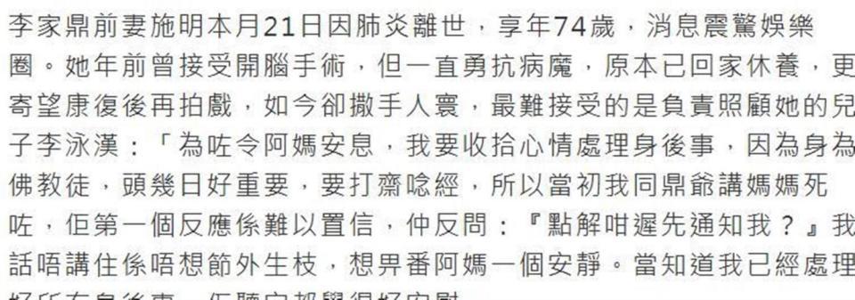 李家鼎接到电话时,第一反应是“吓”了一声,完全无法接受。 他追问儿子:“为什么不早点通知我? ”李泳汉的解释是,想让母亲安息,办一个安静的丧礼,不想节外生枝。